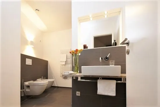 Feinsteinzeug-Bad mit Regenschauerdusche