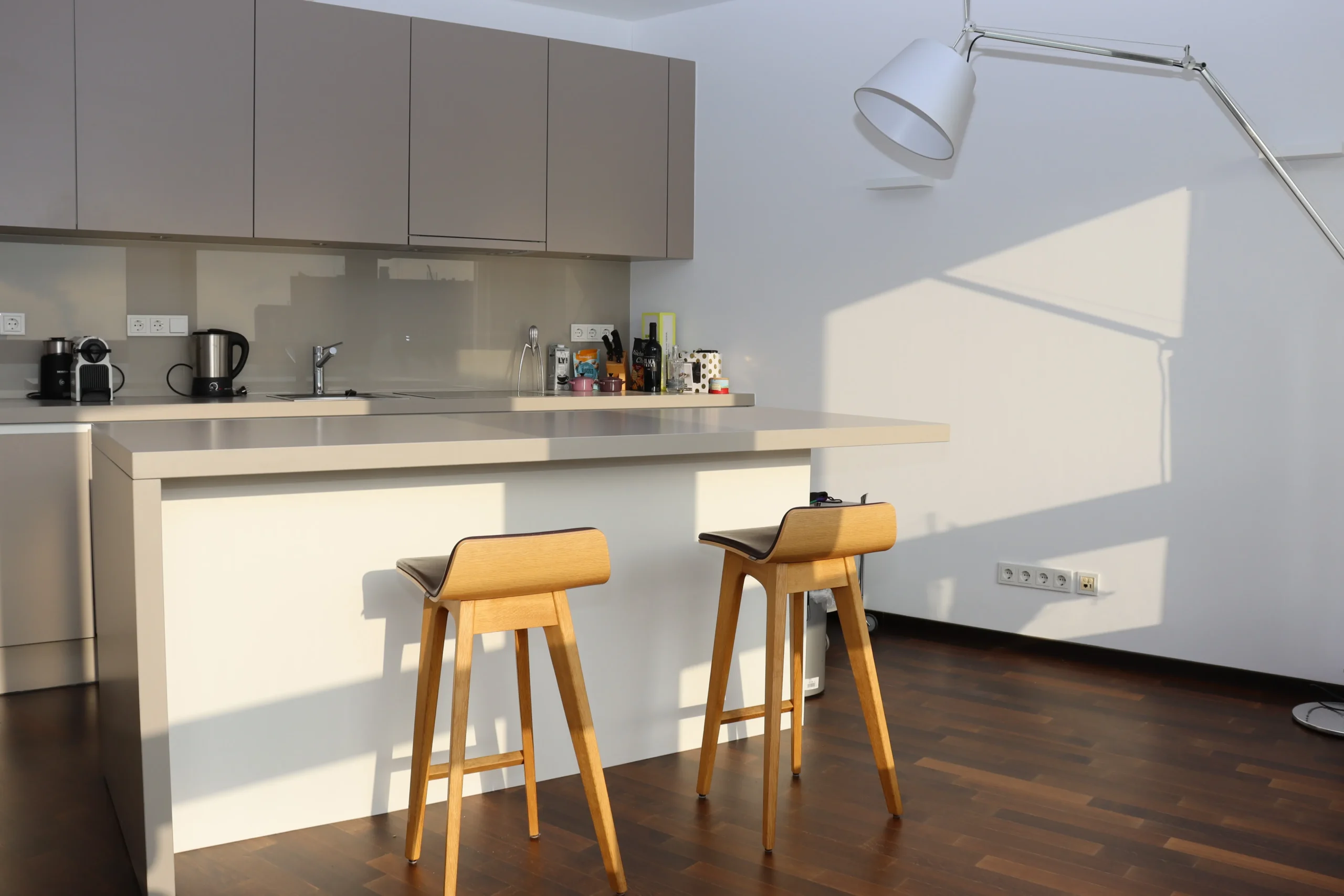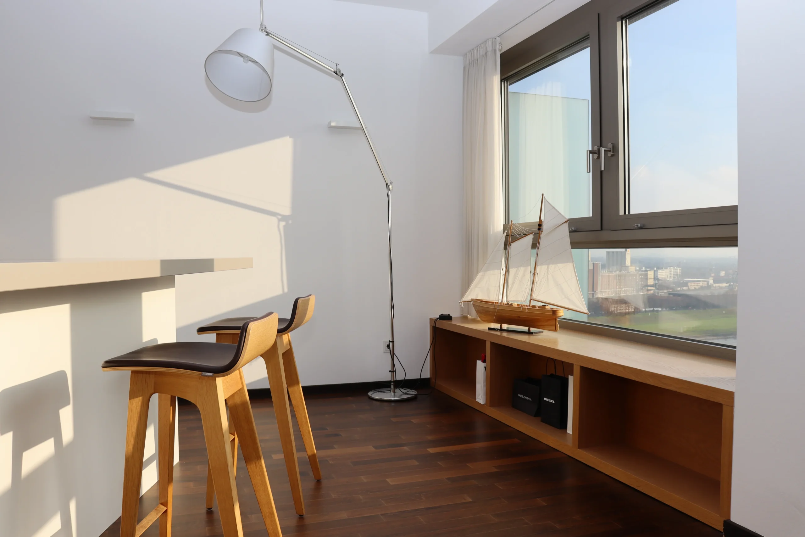 Diese außergewöhnliche Wohnung im Kranhaus Nord bietet auf 58 m² höchsten Wohnkomfort. Große Fensterfronten eröffnen einen atemberaubenden Blick über den Rhein, den Yachthafen und den Kölner Süden. Die Wohnung ist hochwertig möbliert, stilvoll gestaltet und durchdacht aufgeteilt – von der modernen Küche mit Insel bis zum eleganten Schlafzimmer und Bad mit Regenschauerdusche. Fußbodenheizung, dunkles Parkett, schallgedämmte Fenster und ein praktischer Arbeitsplatz im Flur runden das luxuriöse Wohnerlebnis ab.