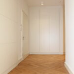 Edle Details: Hochwertiges Eichenparkett im Fischgrätmuster, hohe Decken mit Stuck, Designerleuchten, stilvolle Einbauten