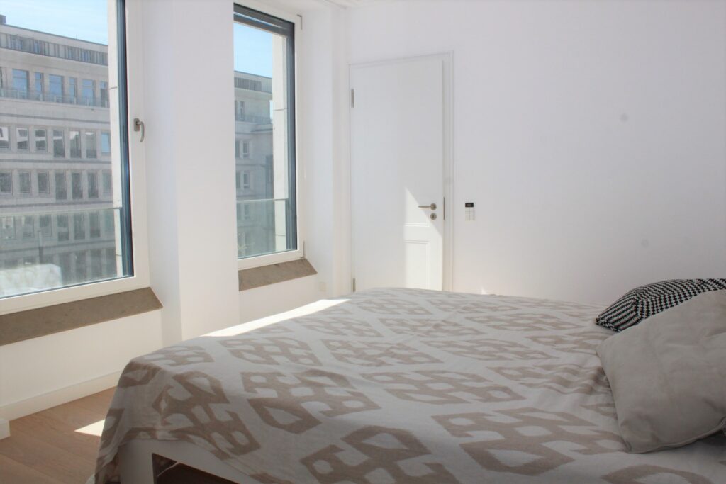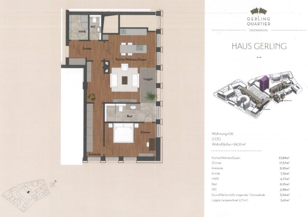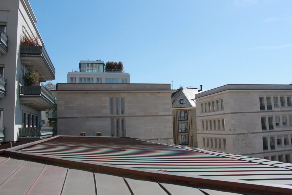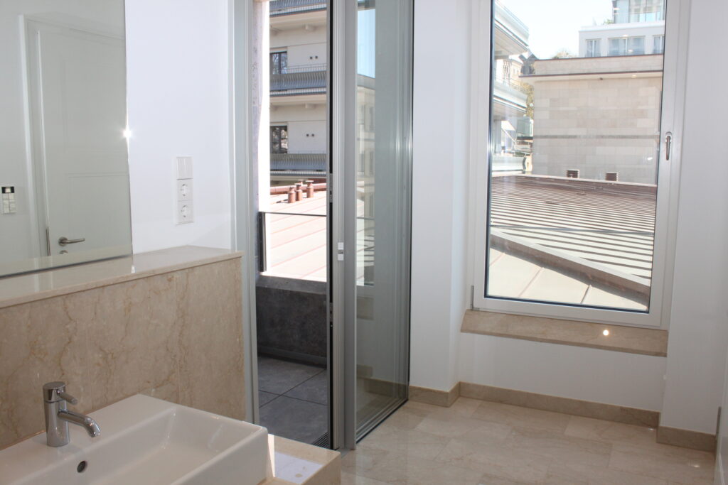 Angrenzend an den Wohnbereich befindet sich die großzügige Loggia, die mit ihren bodentiefen Glasschiebetüren zum Wohnzimmer geöffnet werden kann. Von der Loggia hat man einen weiten Blick über die Dächer und auf das Ensemble des Gerling Quartiers. Durch einen langen Flur, der mit angefertigtem Einbauschrank als Ankleide dient, betritt man das lichtdurchflutete Schlafzimmer mit herrlichem Blick auf die weitläufige Piazza. An das Schlafzimmer schließt sich das schöne, in hellem Naturstein gehaltene Bad mit hochwertigen Sanitärobjekten an. Die bodengleiche Dusche ist mit einer Regendusche und einer Handdusche ausgestattet. Der Spiegel ist beheizbar. Die Loggia kann vom Bad aus betreten werden.