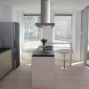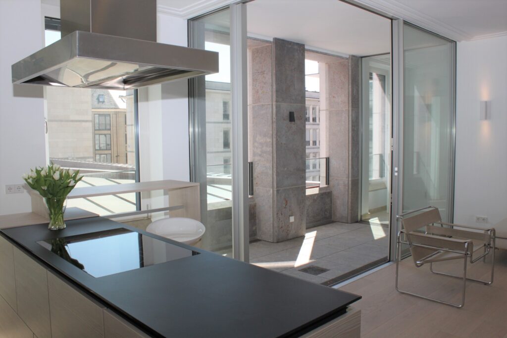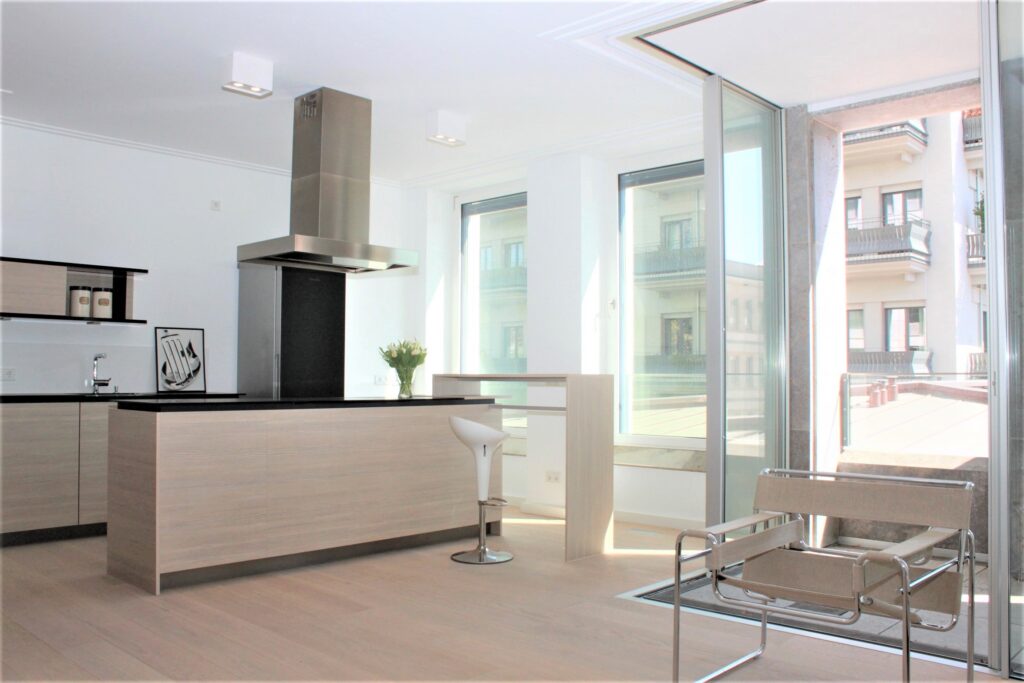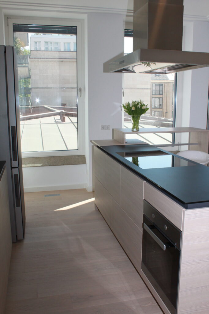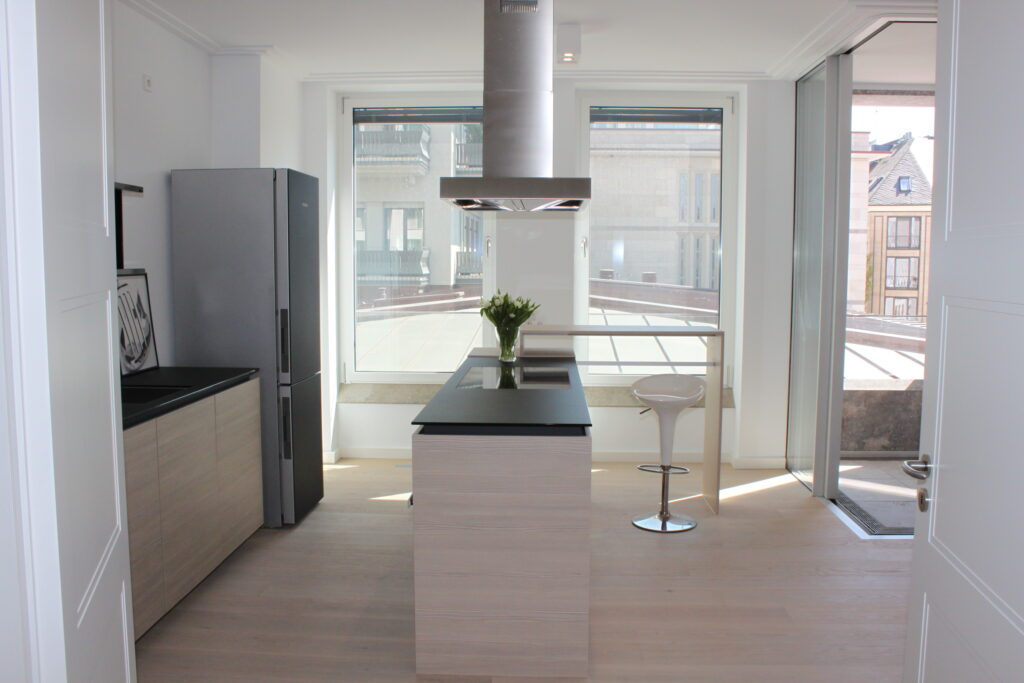 Durch Flügeltüren gelangen Sie in den hellen Wohnbereich mit einladender, offener Küche. Die hochwertige Poggenpohl-Einbauküche mit Kochinsel und kleiner Theke ist farblich dem hellen Dielenboden, der in der ganzen Wohnung verlegt ist, angepasst. Ein Highlight, neben den anderen Miele-Einbaugeräten, ist der in schwarz-edelstahl gehaltene Kühlschrank.