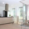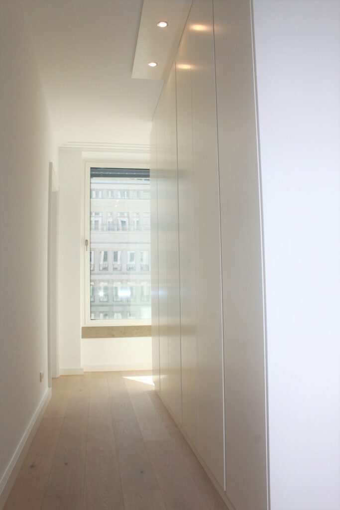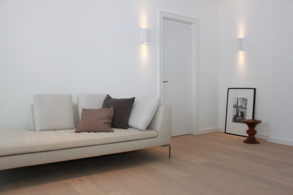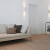 Die ganze Wohnung ist mit modernen, weißen Decken- und Wandleuchten ausgestattet.