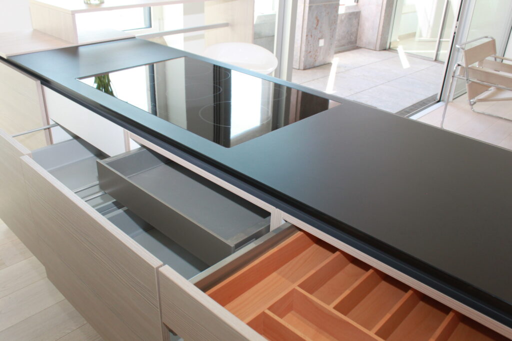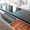 Das große Induktionskochfeld der Marke Bosch bildet den Mittelpunkt der Kochinsel.