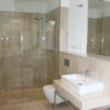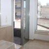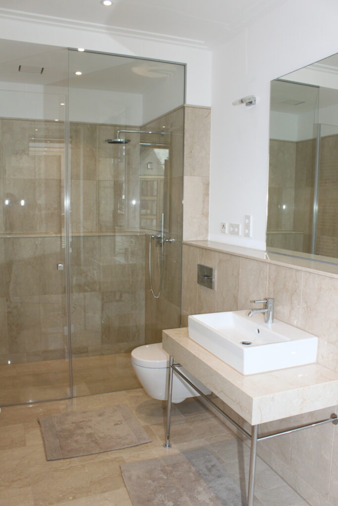 Ein ebenfalls in Naturstein gehaltenes Gäste-WC und ein praktischer Hausarbeitsraum, mit Anschluss für Waschmaschine und Trockner, befinden sich im Eingangsbereich der Wohnung. In der Diele bietet ein eigens angefertigter großer Garderobenschrank viel Stauraum.