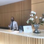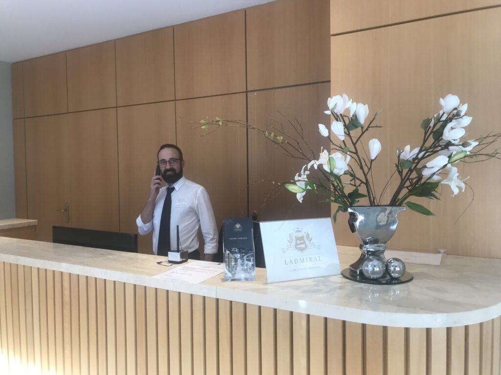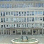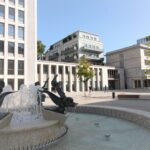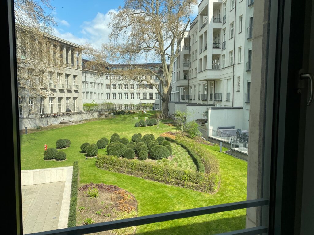 Die große Fensterfront durchflutet den Raum mit viel Licht und gibt einen herrlichen Blick auf die wunderbare, weitläufige Piazza mit ihren Springbrunnen frei.
