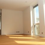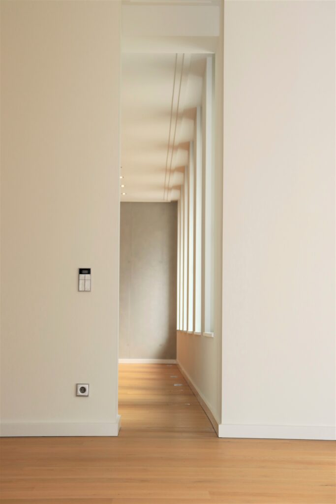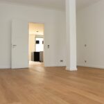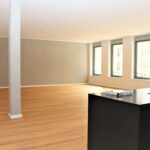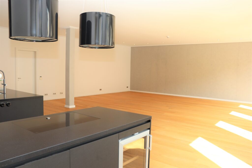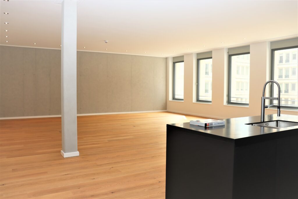 Anspruchsvolle Ausstattungsdetails wie hohe Decken mit umlaufenden Profilleisten, Dielenboden, die hochwertigen Tür- und Fensterelemente in Kombination mit der modernen, dunklen Designerküche und der offenen Betonwand machen das besondere und stylische Ambiente des Lofts aus.