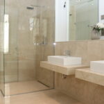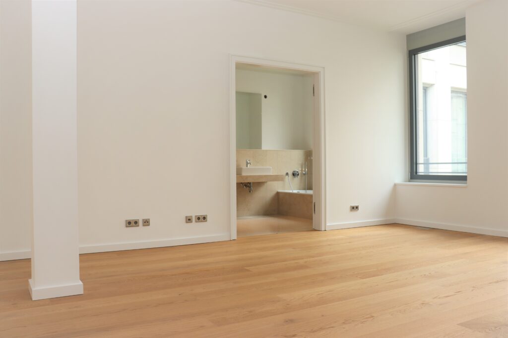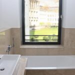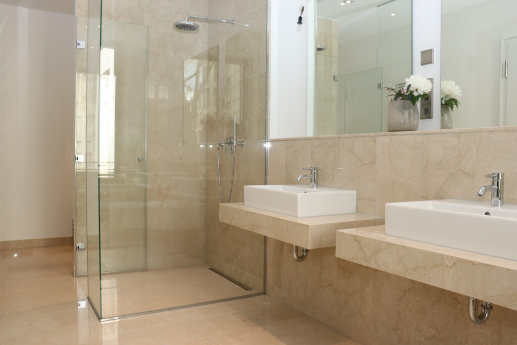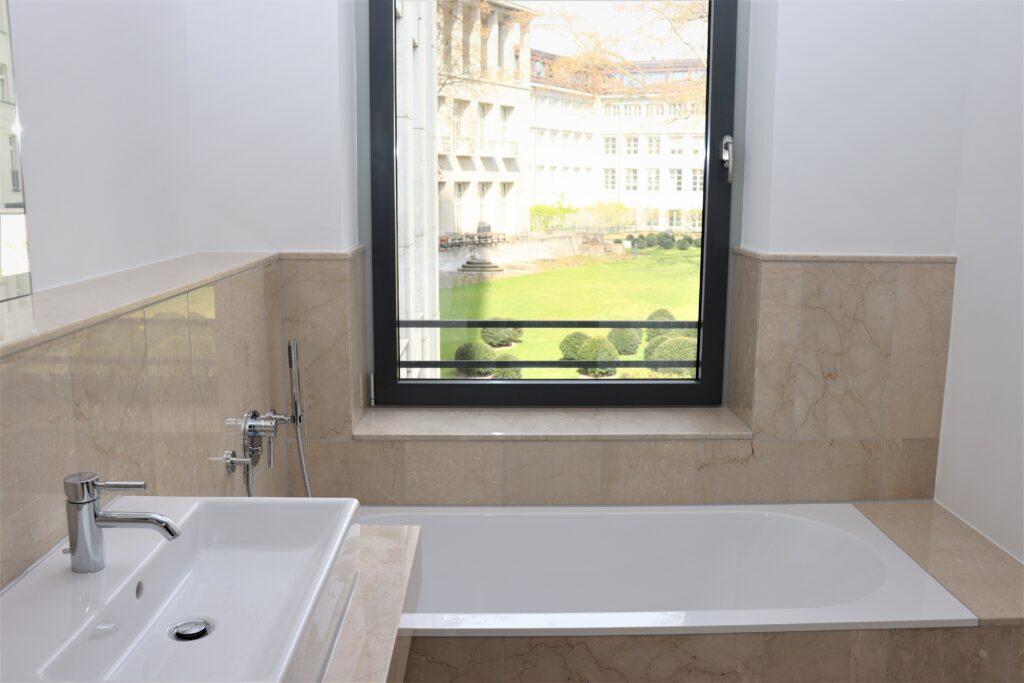 Wie der Rest der Wohnung wurden auch die in hellem Naturstein gehaltenen Bäder anspruchsvollst mit hochwertigen Sanitärobjekten, ebenerdiger Regenschwalldusche und Naturstein-Waschtischen ausgestattet. Im Masterbad befindet sich zusätzlich eine Badewanne (mit Parkblick!) und ein Bidet.