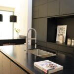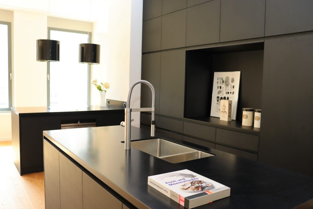 Die offene Küche mit großer Kochinsel und Weinkühlschrank wurde auf Maß gefertigt. Sie lässt das Herz eines jeden Hobbykochs höher schlagen! Reichlich Einbauschränke und Schubfächer bieten viel Stauraum. Freuen Sie sich auf wunderbare Kochevents!