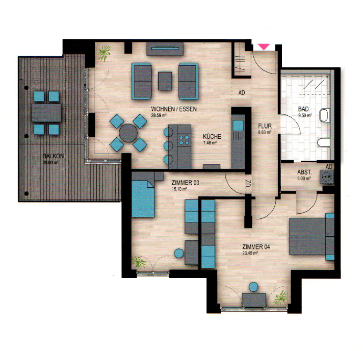 An den geräumigen Wohnbereich mit offener Küche schließt sich die Terrasse in Südausrichtung an. Sie bietet Ihnen weitere 20qm Lebensqualität! Details wie hochwertiger Parkettboden, Fußbodenheizung, großzügige Fensterfronten, elektrische Außenjalousien, Rainshowerdusche, Sicherheitstür, Videosprechanlage unterstreichen die besondere Qualität der Wohnung.