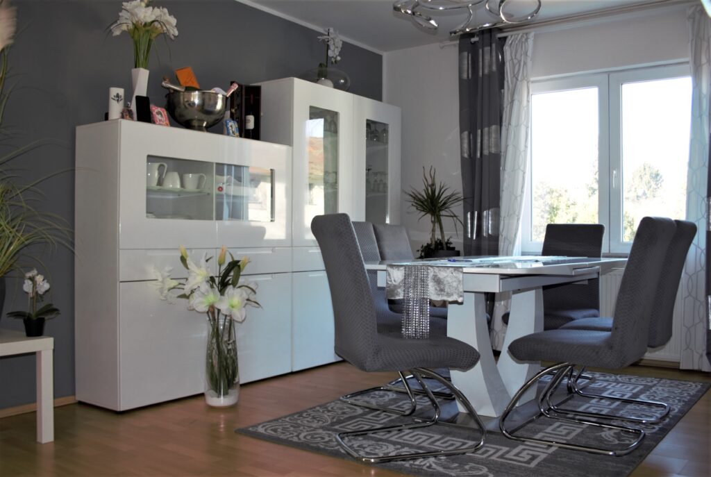 Im Erdgeschoss liegt der große, helle Wohn-/ Essbereich mit Zutritt zum Garten und angrenzender Küche sowie das Schlafzimmer.