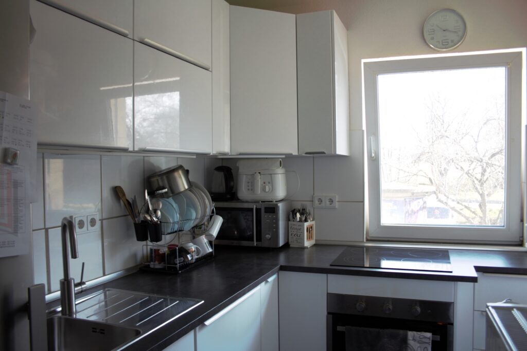 Im 1. OG befinden sich das Wohn-/Esszimmer, die Küche, ein Schlafzimmer und ein Badezimmer mit Fenster.
